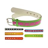 Vibrant?vinyl style belt with appliqued stripe and dot style, Silvertone roller buckle, 11/two" wide, suits 30"-35" waistline, assorted colours, separately bagged.