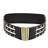 Ladies black elasticated waist belt, designed with gold tone metal rivets decor and interlocking buckle closure. Lovely and graceful waistline belt fits for females putting on on any occasion to insert elegant appear. Trendy and stylish fashion, great accent for females use to match with divers attire, extended shirts, etc. You should make sure the belt size suits for you prior to purchasing.